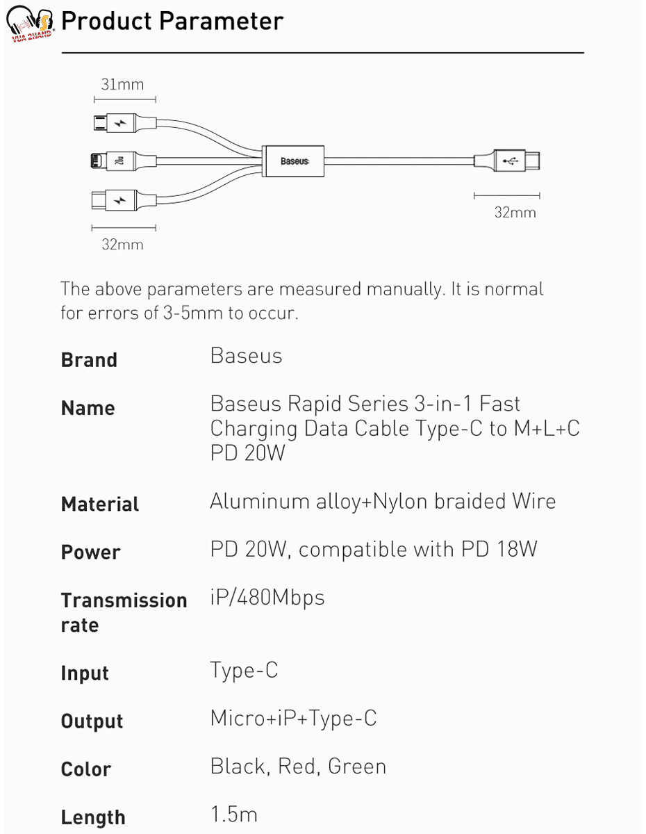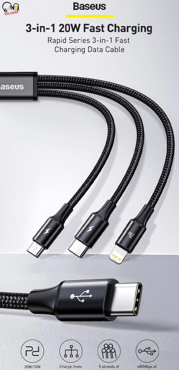 - Cáp sạc 3 đầu Baseus Rapid Series 3-in-1 PD 20W hỗ trợ chuẩn sạc nhanh C to Lightning 20W/18W trên các dòng iPhone 12/11 và hỗ trợ dòng sạc 3A/2A trên các cổng C và Micro (3A/2A Fast charge) giúp cải thiện đáng kể tốc độ sạc so với các thế hệ cáp sạc 3 in 1 trước đây.