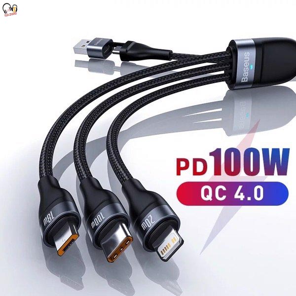 Dòng sản phẩm Baseus Flash Cáp dữ liệu sạc nhanh hai cho ba U + C đến M + L + C 100W. Tất cả các cổng đều được sạc nhanh trong cáp này. Đầu vào: USB + Type-C. Đầu ra: Micro + iP + Type-C. Chip nhận dạng cho thiết bị sạc nhanhPhân phối thông minh dòng điện và điện áp cho các cổng khác nhau để đảm bảo sạc nhanh an toàn.8 sợi lõi dàyChỉ bằng cách tăng diện tích dẫn, một cáp với hai đầu vào và ba đầu ra có thể hỗ trợ sạc nhanh các thiết bị khác nhau