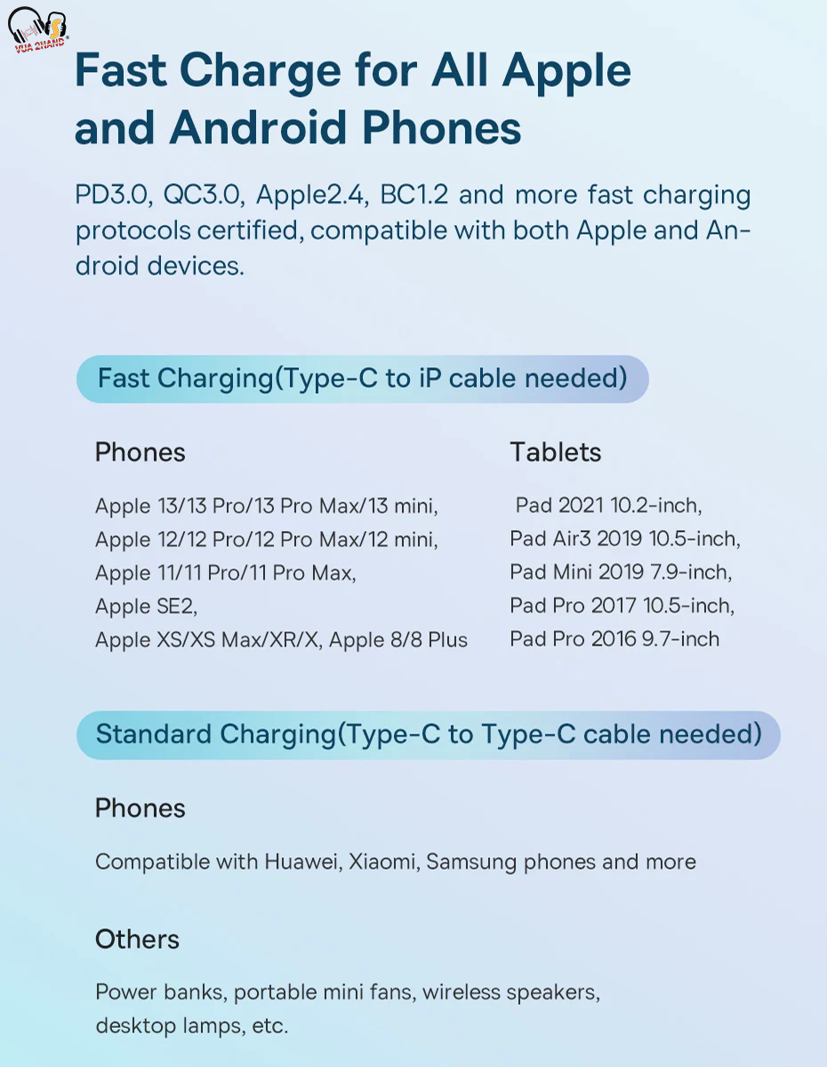 - Tất cả Apple 8 và trên các dòng máy hỗ trợ PD sạc nhanh, giúp tăng tốc độ sạc thời gian gấp 3 lần so với 5V/1A sạc.