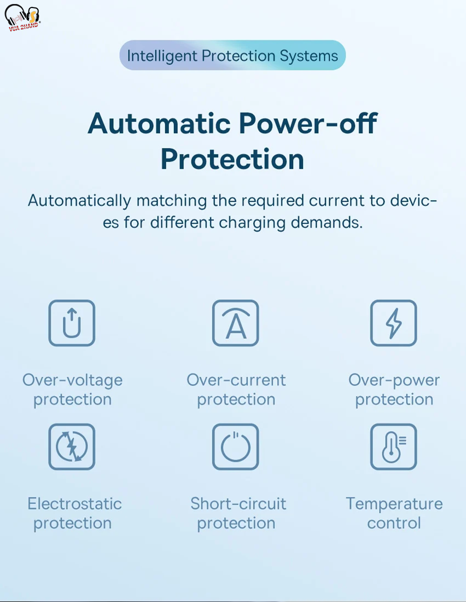 - Khả năng tự động nhận diện và điều chỉnh cấu hình điện áp sạc ngỏ ra tối ưu cho từng thiết bị. Cơ chế bảo vệ thông minh, tự động ngắt sạc khi sạc đầy, bảo đảm an toàn tuyệt đối cho thiết bị và người sử dụng .