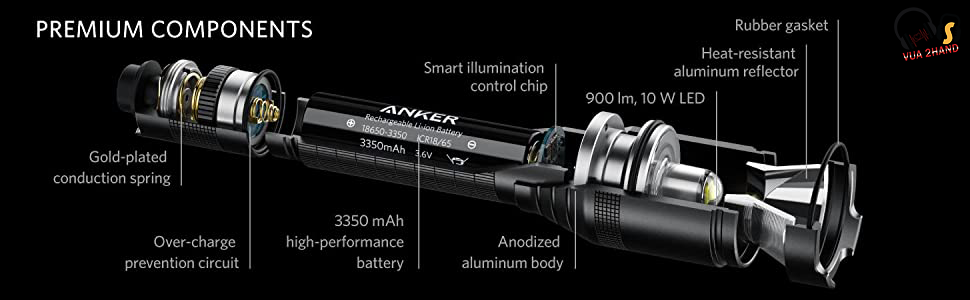 - Chip Cree LED XM-L2 hiệu suất cao mang lại độ sáng mạnh trong 50000 giờ. Đèn LED 900 Lumen được cung cấp năng lượng bởi công nghệ pin tiên tiến của Anker giúp ngăn ngừa tình trạng sạc quá mức và thiếu, duy trì tuổi thọ của pin.