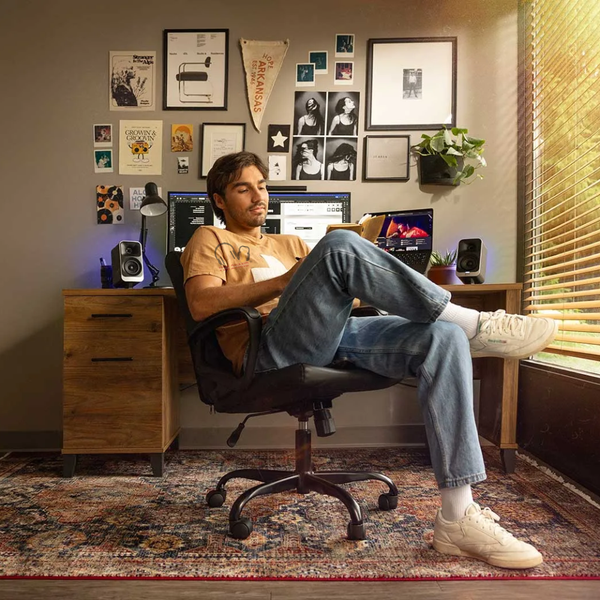 Phong cách Vintage & Hiện đại: Thùng loa phủ vân gỗ sang trọng trên nền màu đen thời thượng, tạo cảm giác vừa cổ điển vừa chuyên nghiệp cho góc làm việc.