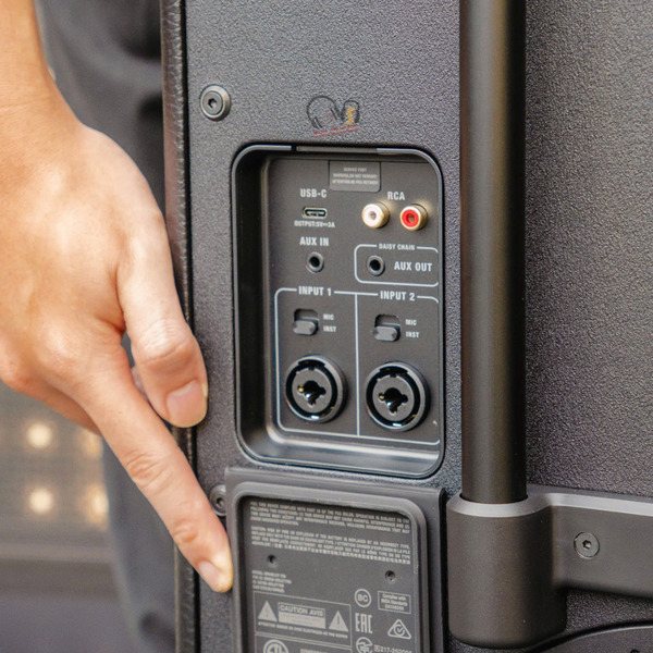 | Tính năng khác | Tích hợp đèn LED sân khấu với 3 chế độ ánh sáng Tay cầm và bánh xe để di chuyển dễ dàng Có lỗ thoát nước cho loa tweeter |