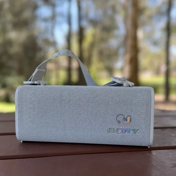 Thiết Kế Chắc Chắn: Loa có thiết kế hình trụ/thanh ngang (pill-shaped) cổ điển của Sony, với vỏ ngoài được làm từ vật liệu bền bỉ và lưới tản nhiệt kim loại chắc chắn.