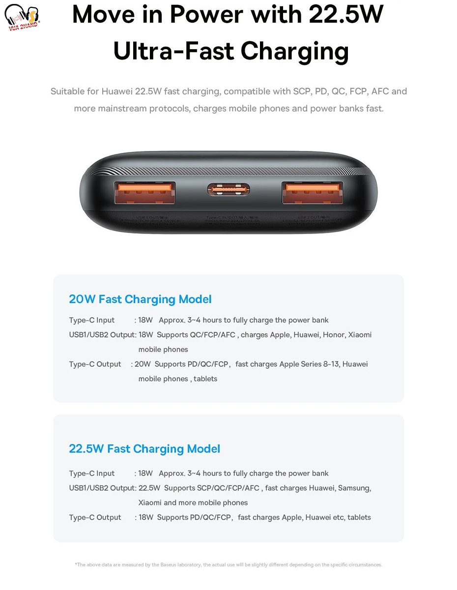 - Ngỏ ra : hỗ trợ nhiều mức cấu hình và công suất khác nhau gồm Port USB 22.5W ( 4.5V/5A(SCP), 5V/4.5A(SCP), 5V/3A, 9V/2A, 12V/1.5A) và Type C PD 20W ( 5V/3A, 9V/2.22A, 12V/1.5A)... Tương thích với hầu hết các chuẩn sạc nhanh trên smartphone, tablet, iPhone/ iPad có hỗ trợ sạc qua cổng Type C PD.
