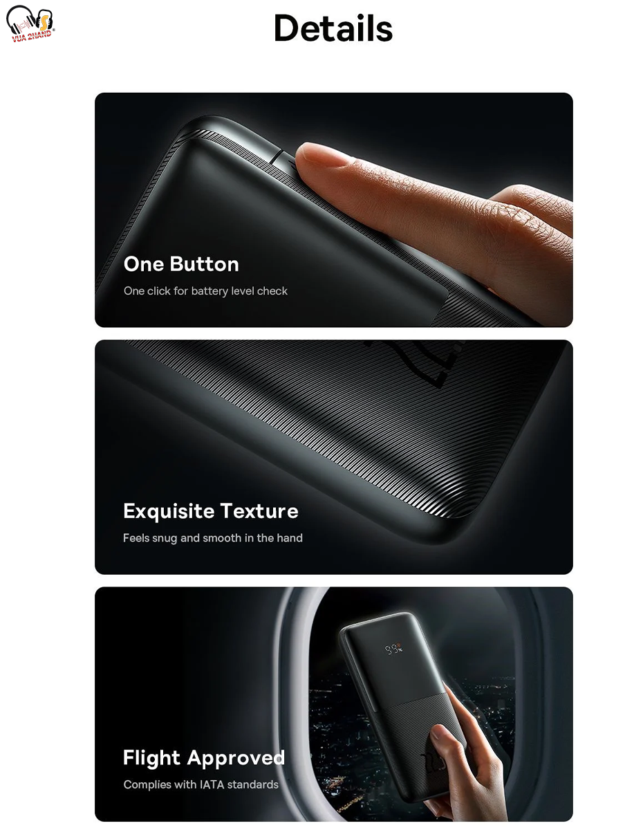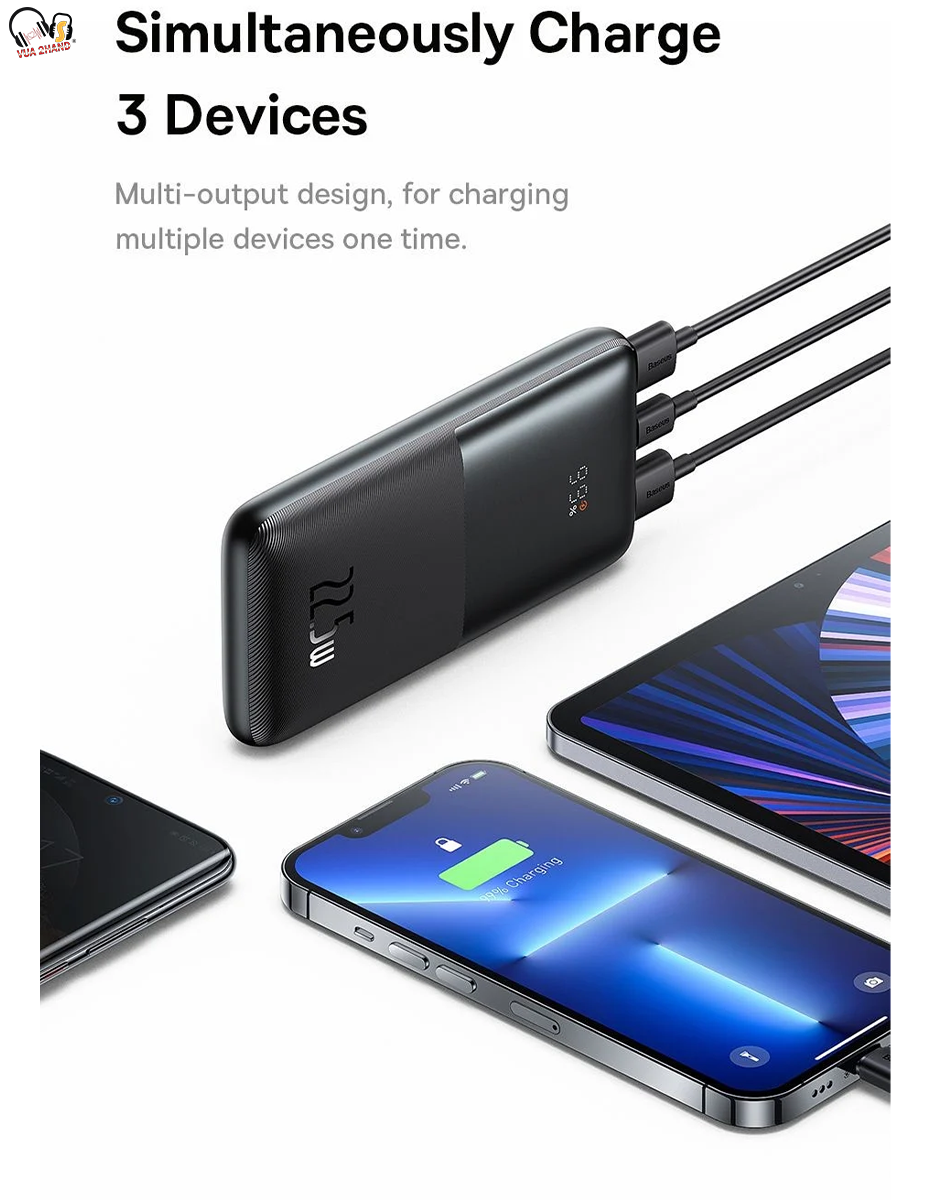 - Pin Dự Phòng Sạc Nhanh Thế Hệ Mới Baseus Bipow Pro 10000mAh có 3 cổng sạc chính 2 USB và Type C(support in/ out) . Cả 3 Port này đều hỗ trợ sạc nhanh (QC3.0 và PD3.0) , sản phẩm có thể dùng sạc pin cho cả 3 thiết bị cùng lúc . Giúp bạn sử dụng thoải mái hơn và quên đi nổi lo hết pin khi đi công tác, du lịch, giả ngoại ... Giúp cho mọi thiết bị của bạn luôn trong tình trạng sẳn sàng sử dụng .