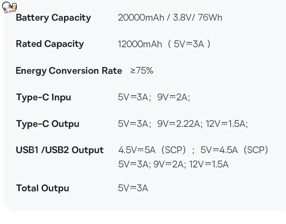 - Ngỏ ra : hỗ trợ nhiều mức cấu hình và công suất khác nhau gồm Port USB 22.5W ( 4.5V/5A(SCP), 5V/4.5A(SCP), 5V/3A, 9V/2A, 12V/1.5A) và Type C PD 20W ( 5V/3A, 9V/2.22A, 12V/1.5A)... Tương thích với hầu hết các chuẩn sạc nhanh trên smartphone, tablet, iPhone/ iPad có hỗ trợ sạc qua cổng Type C PD.