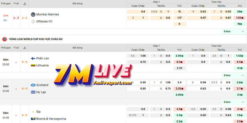- Timeline tỷ số trực tuyến 7m: các sự kiện theo phút.