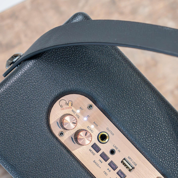Thiết kế Sang trọng: Loa thường có kiểu dáng thùng gỗ bọc da cao cấp (thường là màu đen hoặc nâu) và quai xách tiện lợi. Thiết kế này khiến loa trông như một món phụ kiện thời trang, dễ dàng hòa hợp với nhiều không gian nội thất.