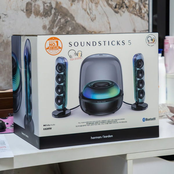 Tóm lại: Harman Kardon SoundSticks 5 là một bản nâng cấp toàn diện, kết hợp hoàn hảo giữa thiết kế nghệ thuật độc đáo (trong suốt, LED RGB) và chất lượng âm thanh mạnh mẽ, chi tiết (công suất lớn, cấu hình 3 đường tiếng, bass uy lực), cùng với các kết nối hiện đại (HDMI ARC, Bluetooth 5.4, Auracast). Đây là một lựa chọn tuyệt vời cho những ai tìm kiếm một hệ thống loa vừa có hiệu suất cao vừa là một món đồ nội thất đẳng cấp.