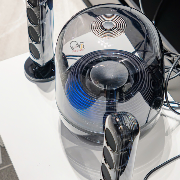 Thiết kế trong suốt biểu tượng: Vẫn giữ nguyên vẻ ngoài độc đáo với vỏ trong suốt cho cả loa subwoofer (siêu trầm) và hai loa vệ tinh, cho phép nhìn thấy các củ loa bên trong.