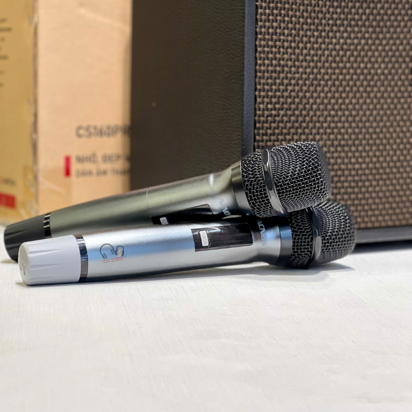 Micro không dây: Đi kèm với 2 micro không dây UHF cao cấp, hút âm tốt, nhẹ hơi, giúp người dùng hát karaoke chuyên nghiệp mà không bị mỏi.