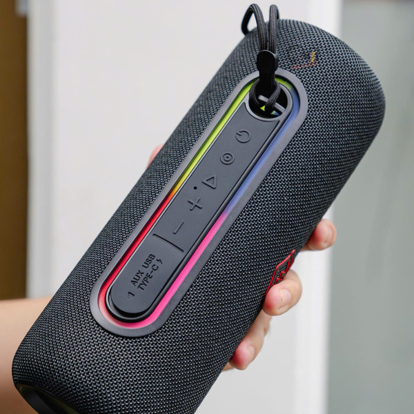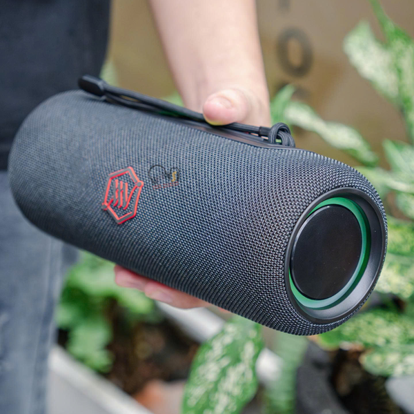 Thiết kế: Loa có kiểu dáng hình trụ (giống như một chai nước lớn), hiện đại và trẻ trung. Vỏ ngoài được bọc bằng chất liệu vải dệt cao cấp, cầm nắm chắc chắn và nhẹ.