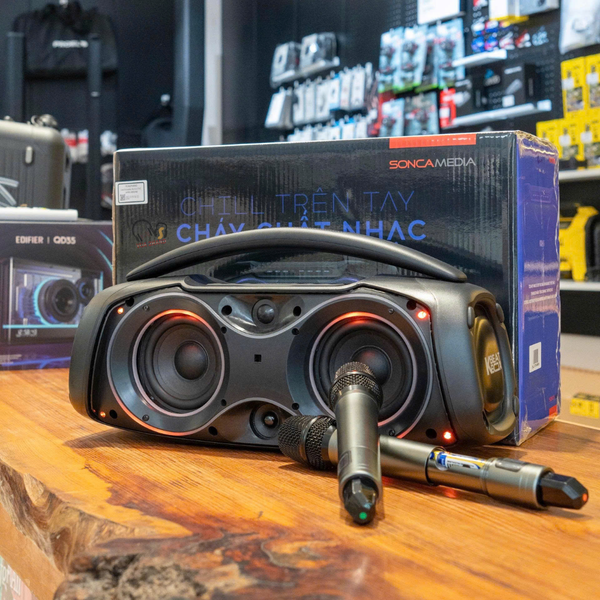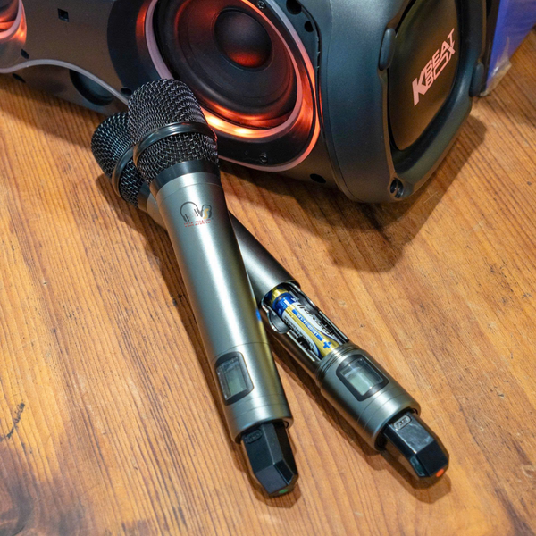 Micro không dây: Đi kèm 2 micro UHF bằng nhôm nhẹ, hút âm tốt, chống hú di động hiệu quả, giúp nâng tông giọng tự nhiên.