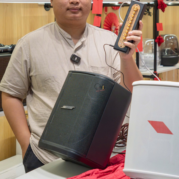 Cân chỉnh: Trên Bose S1 Pro+, hãy nhấn nút volume để chỉnh về chế độ LINE (biểu tượng không có mic/nhạc cụ) để tránh bị vỡ tiếng.