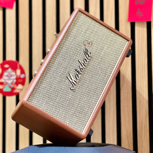 Mặt trước: Lưới loa bằng kim loại với logo Marshall mạ đồng sang trọng.