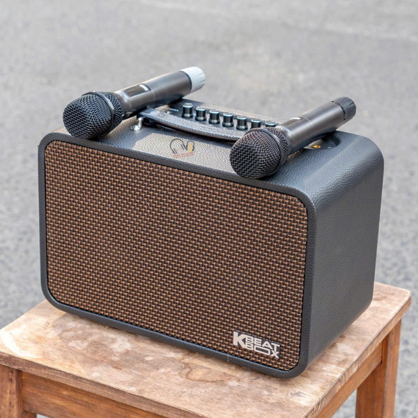 Đi kèm loa là cặp micro không dây sử dụng sóng UHF (tần số siêu cao).