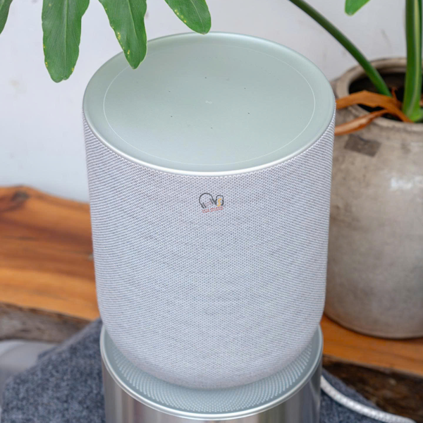Mặt trên của loa là một tấm nhôm tinh xảo. Nhờ cảm biến tiệm cận, các nút điều khiển chỉ phát sáng khi bạn tiến lại gần. Khi bạn đi xa, các đèn này mờ dần và biến mất, để lại một khối điêu khắc tĩnh lặng.