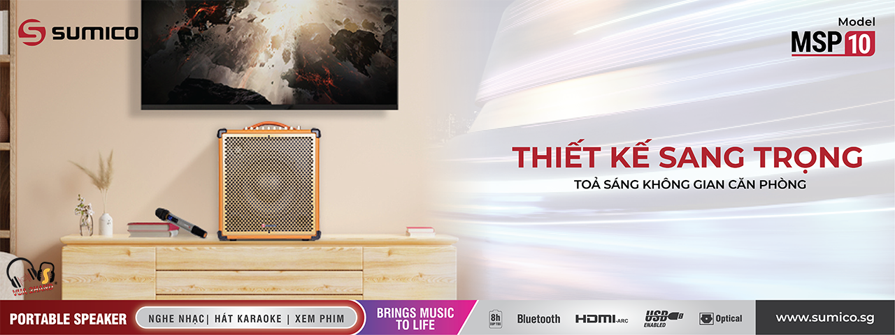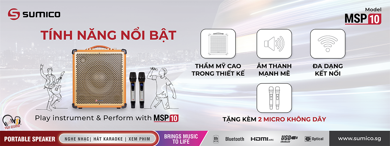 Sumico MSP-10 là mẫu karaoke di động được thiết kế để hướng đến người dùng có yêu cầu về chất lượng âm thanh. Gây ấn tượng với thiết kế độc đáo, màu sắc sa huỳnh sang trọng, chất âm mạnh mẽ được tích hợp sẵn pin và 2 micro không dây đi kèm, Sumico MSP-10 mang đến trải nghiệm ca hát sôi động, thích hợp cho các chuyến đi dã ngoại, party,..