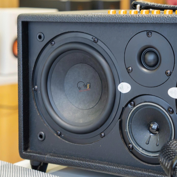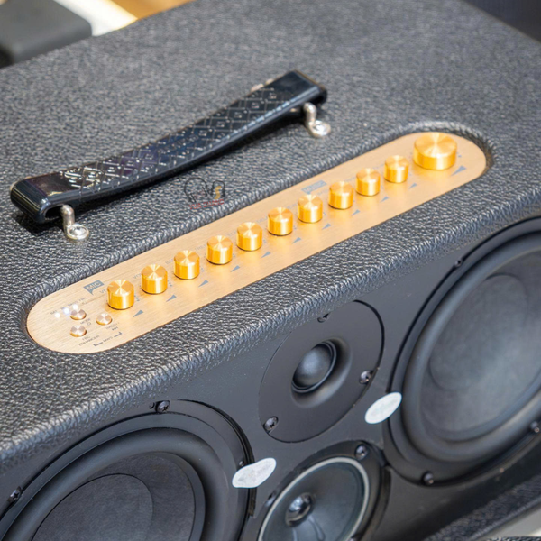 Thiết kế: Thùng gỗ bọc da đen sang trọng, kích thước gọn gàng (nặng khoảng 13kg) với quai xách chắc chắn, dễ dàng di chuyển.
